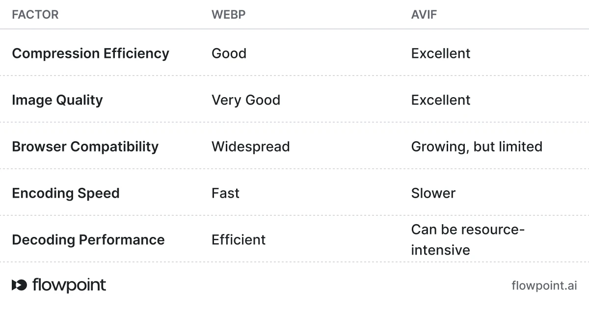 To help you choose between WebP and AVIF, let's compare them across key factors: